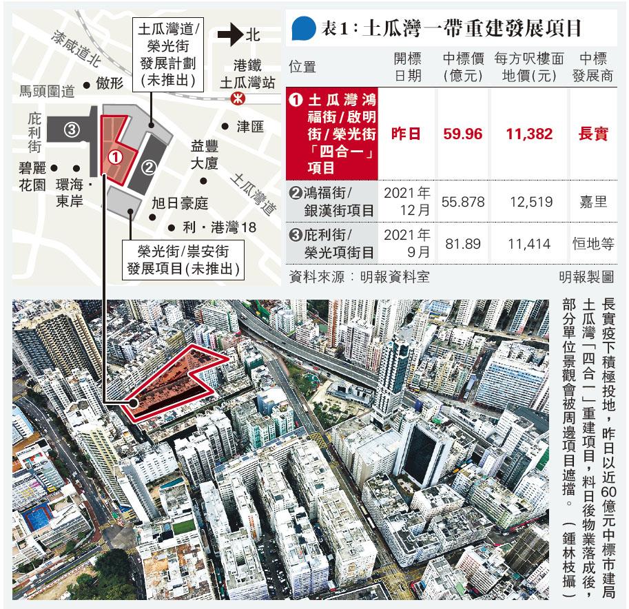 【明報專訊】新冠疫情下,長實(1113)趁低吸納,積極增加土地儲備。長實昨日以59.96億元投得市建局土瓜灣鴻福街、啟明街及榮光街的「四合一」重建項目發展權,以最高樓面52.68萬方呎計,每方呎樓面地價11,382元(見表1),中標價較市場預期下限、每方呎樓面地價1.2萬元低約5%。是次為自2020年本港爆發疫情後,長實第4度中標官地或市建局重建項目,其中3個為大型項目(見表2),金額共涉219.43億元,吸納可建樓面 高達234.25萬方呎土儲。