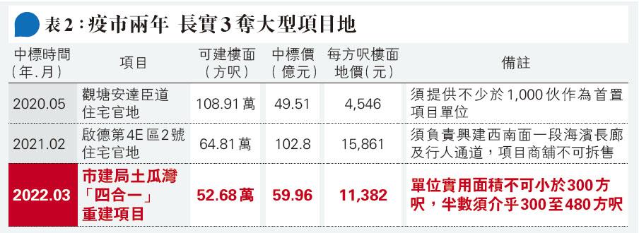 翻查資料,長實自本港爆發疫情後,先後3次中標住宅官地,以去年2月中標啟德第4E區2號住宅官地的金額最高,以102.8億元、每方呎樓面地價15,861元奪得跑道區住宅官地,中標價貼近當時市場估值上限,亦是長實首度插旗啟德新發展區。此外,長實2020年5月以49.51億元中標首幅公私營合作的港人首置上車盤地盤,當中有1000伙須作為首置項目單位;另去年8月,長實以高於市場估值14%、以7.16億元投得元朗流業街與涌業路交界住宅官地。連同昨日中標土瓜灣「四合一」項目,長實不足兩年斥資219.43億元購入4幅地皮、共涉234.25萬方呎樓面。