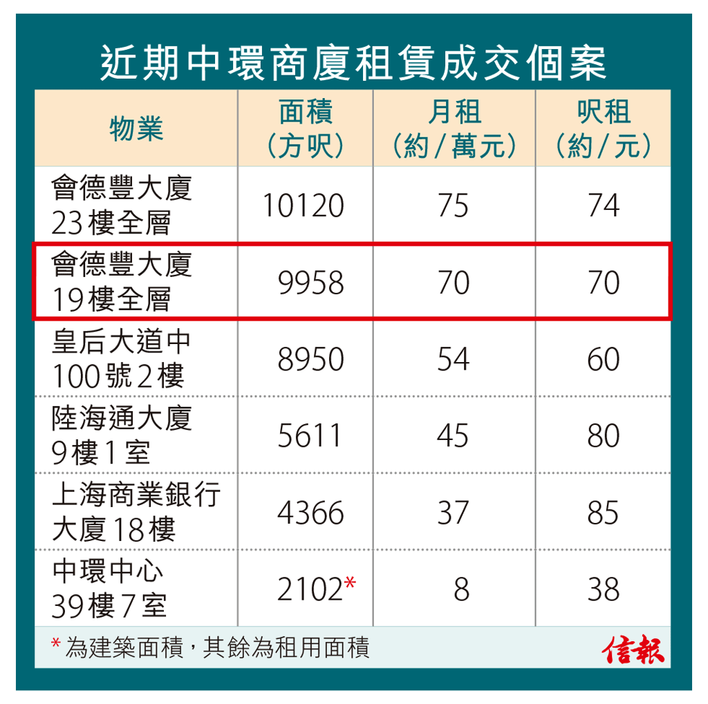 市場消息指出,交通銀行(香港)承租畢打街20號會德豐大廈19樓全層,租用面積約9958方呎,月租約70萬元,呎租約70元。該層單位原分拆成4個較細單位出租,租戶包括律師樓及保險公司等,大業主九龍倉置業(01997)待各租客約滿後,將其打通成全層租予單一租戶。